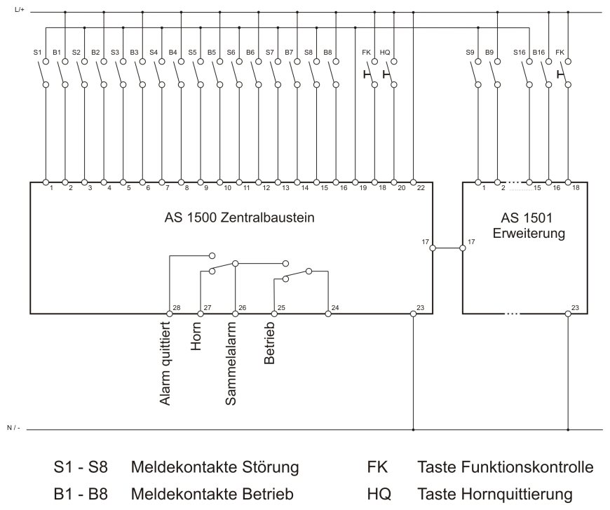 Das AS1500 ist ein Betriebs- und Störmelder mit 8 Eingängen. Mit dem Erweiterungsbaustein kann das System bis zu 32 Meldungen erweitert werden. Bei Betrieb Leuchten die LED dauernd bei Störung blinken sie. Sobald ein Störungskontakt schliesst wird der Hornausgang bis zur Quittierung geschlossen. Zur Störungsquittierung steht auf dem Zentralbaustein eine Quittiertaste oder ein externer Eingang zur Verfügung. Mit dem Potentiometer auf der Gerätefront kann die Ansprechverzögerung (bis 160s) für alle Eingänge eingestellt werden.Der Aufbau erfolgt auf DIN-Schiene.
