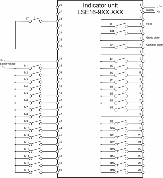 The LSE indicator unit is equipped with 16 LEDs for signalling and 1 green LED for indicating the system's operation.