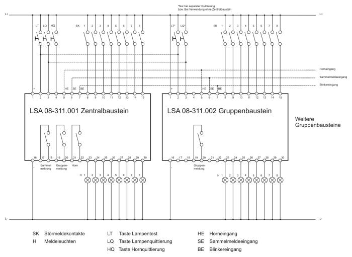 Bei mehr als 8 Meldungen pro Anlage können über Busverbindungen entweder weitere Geräte des Typs LSA 08-311001 oder spezielle Erweiterungsgeräte des Typs LSA08-311.002 zugeschaltet werden. Die Erweiterungsgeräte enthalten 8 Meldeeingänge und 8 Meldeausgänge sowie einen Relaisausgang für Gruppenmeldung, jedoch keine zentralen Funktionen wie Blinker, Hupenausgang und Sammelmeldeausgang. Insgesamt können mit Geräten der Baureihe LSA 08 Anlagen mit beliebig vielen Meldungen aufgebaut werden. Dabei muss mindestens ein Gerät LSA08-311.001 verwendet werden, das als Zentralgerät eingesetzt wird.