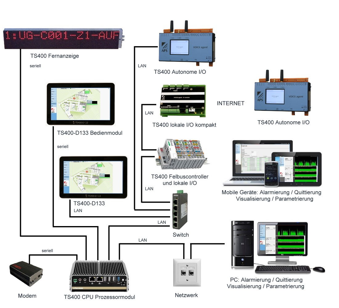 Der VOICE agent kann als autonomes Eingangsmodul für das TS400 verwendet werden. Dadurch kann zusätzlich zur Eingangserfassung ein autonomer, redundanter Alarmierungsweg geschaffen werden. Die Verbindung zum TS400 CPU Prozessormodul erfolgt über das Netzwerk.