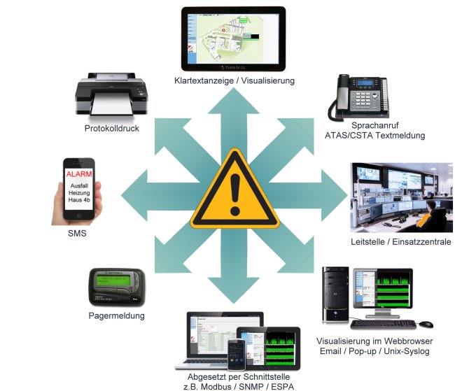 Alle Alarme können auch direkt als Sprachmeldung, Fax, SMS, E-Mail oder Pager-Meldung an vordefinierte Gruppen versandt werden.